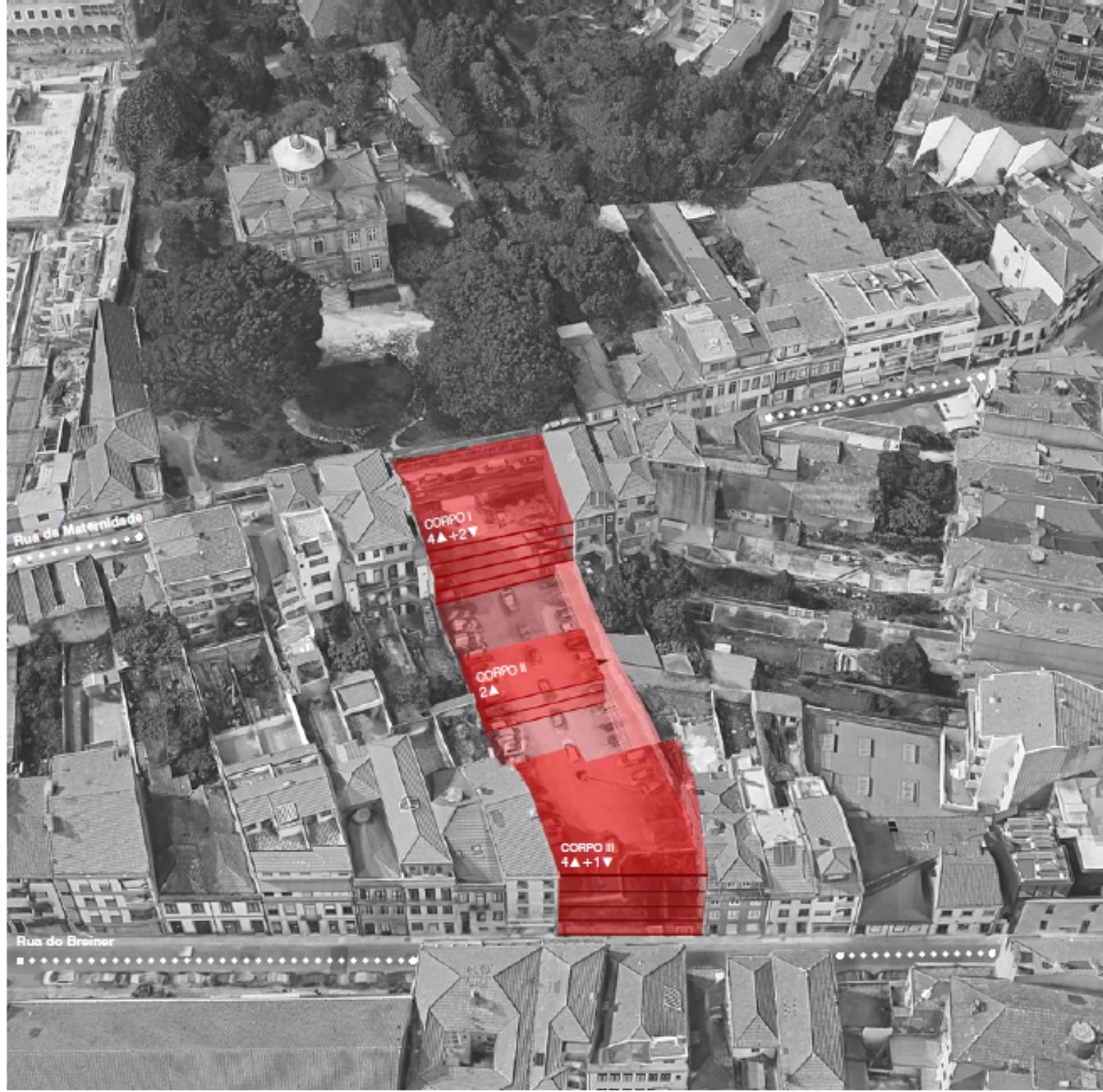 The architectural proposal was developed around a volumetric composition composed of two main buildings facing the street, one on Rua da Maternidade and another on Rua do Breiner, connected by a central body located within the interior of the block.