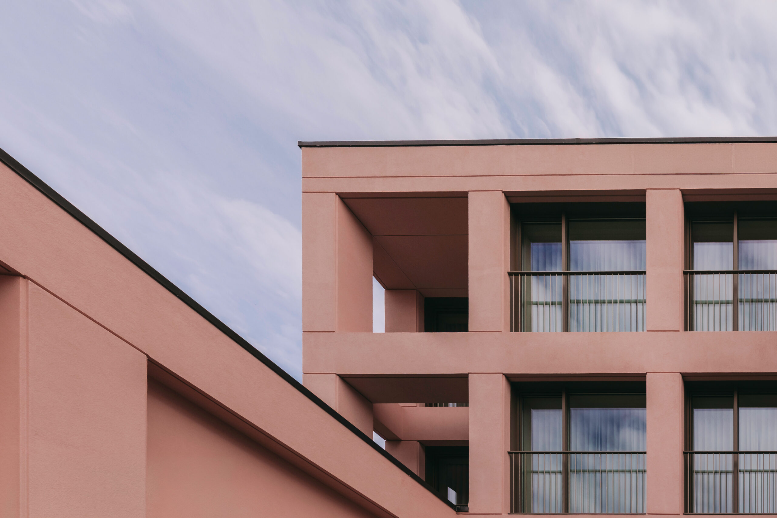 The architectural language is defined by a rational and geometric façade system, where exposed concrete structures create a rhythmic grid that acts simultaneously as a compositional element and as solar protection. This brise-soleil structure frames the glazed surfaces of the rooms, creating a dynamic relationship between light, shadow, and interior spaces.